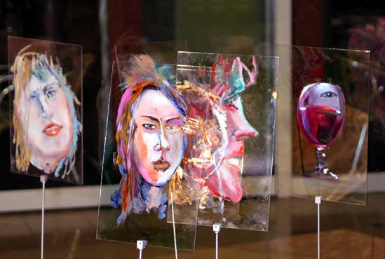 5 Standbildikonen mit Weinglas, Ölfarbe auf Acrylglas, je 15 x 25 cm auf Metallstandfuss mit 1 m Draht montiert