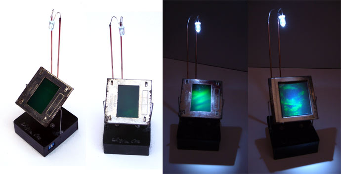 "virtual reality" - Hologramm 1987/88, Objekt 2006. Maße: 55 x 55 x 110mm, 2 Reflexionshologramme, Weißlicht LED, Blech, Draht, Kunststoff.