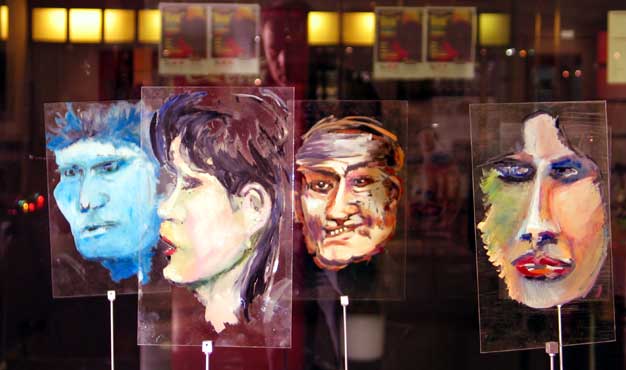 4 Standbildikonen, Ölfarbe auf Acrylglas, je 15 x 25 cm auf Metallstandfuss mit 1 m Draht montiert